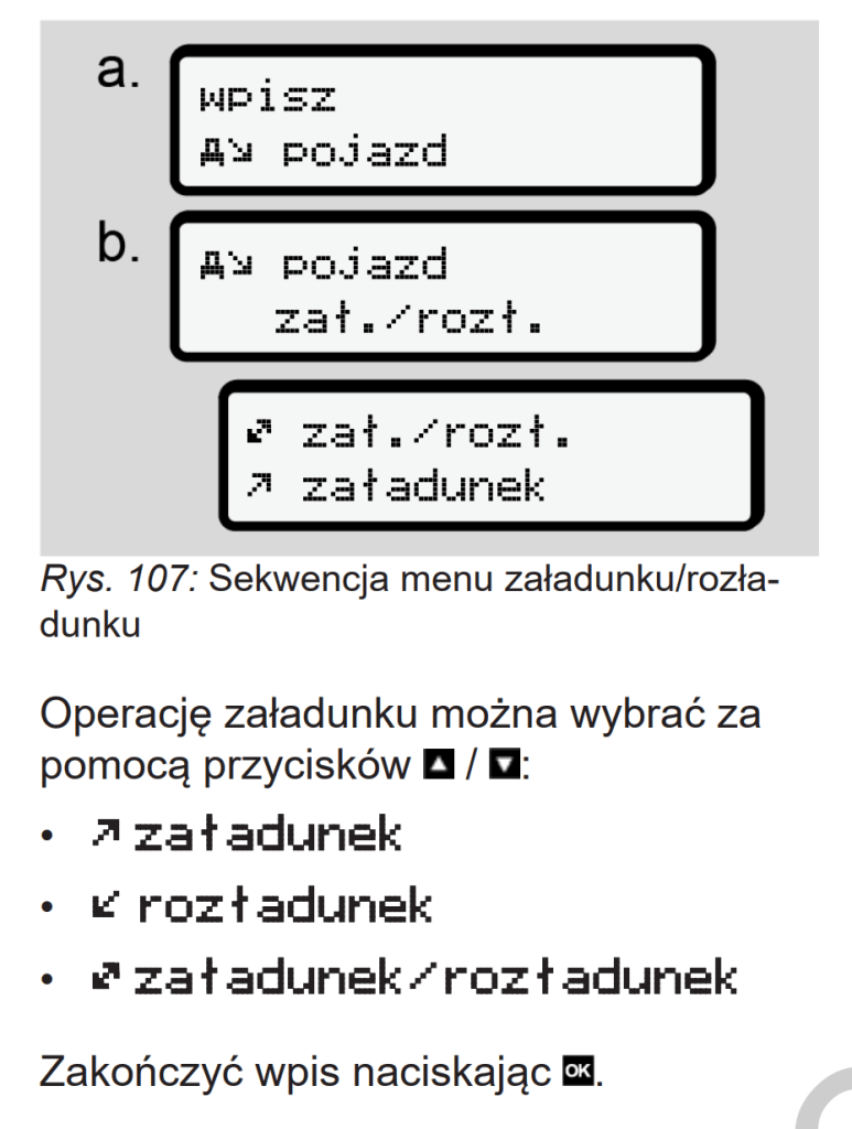 Należy również zwracać uwagę, że jeżeli kierowca uczestniczy w operacji załadunku lub rozładunku, to przy prowadzaniu zapisów „załadunek” lub „rozładunek” tachograf powinien być ustawiony dla kierowcy w pozycji „inna praca” czyli „młotki”.